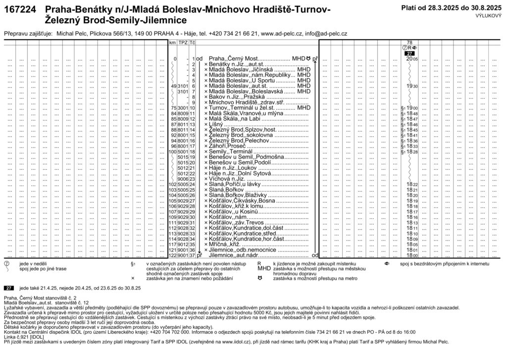 Nově se s našimi autobusy můžete setkávat na pravidelných linkách z Prahy. Všechny naše autobusy jsou vybaveny bezplatnou Wi-Fi sítí, je zde i možné platit jízdné moderně – bezkontaktně! Tarif a přepravní podmínky jsou k dispozici v každém autobusu u řidiče a také v záložce „Ke stažení“. Tarif a přepravní podmínky IDOL na www.iidol.cz aktuální poloha vozů na https://www.mpvnet.cz/idol/map